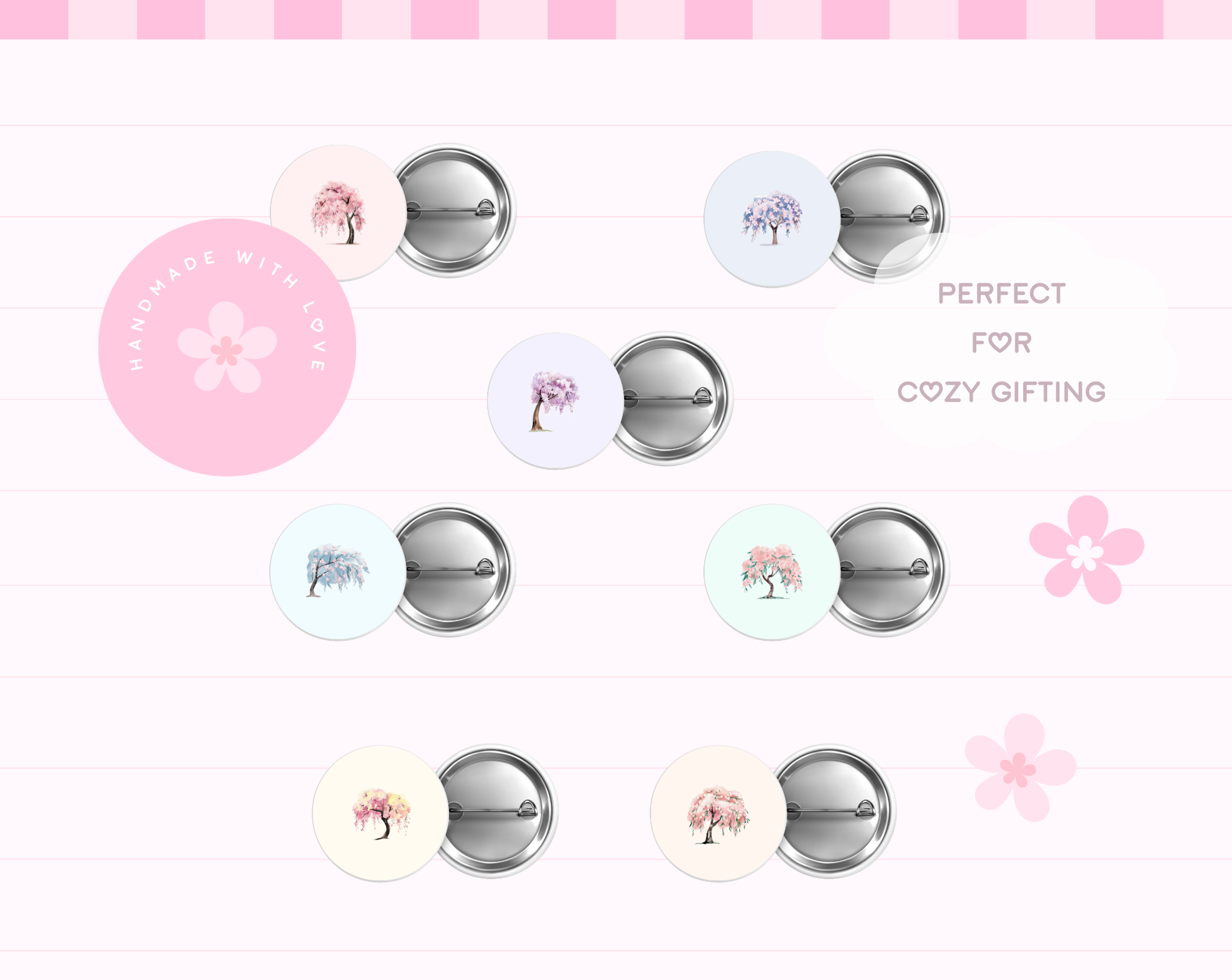 Each pin features a delicate sakura tree illustration inspired by Asian floral art, rendered in soft pastel colorways. Pins are packaged as a blind bag, making every order a fun and cozy surprise — perfect for collectors, gifting, or treating yourself.